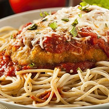 Breast of chicken lightly breaded and pan fried to a golden brown, topped with our own marinara sauce and melted mozzarella cheese. Served with spaghetti and fresh oven toasted garlic bread.